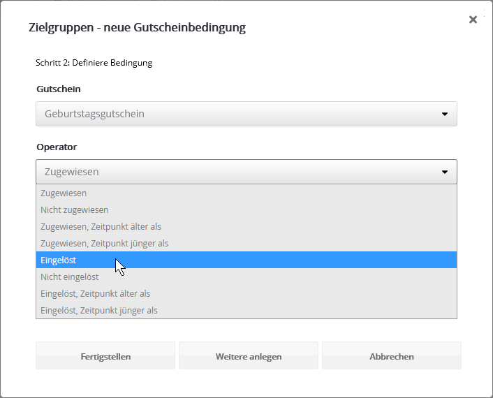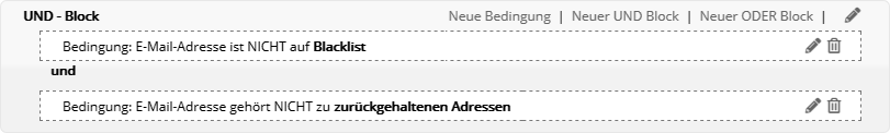 Insbesondere nach dem Kopieren einer vorhandenen Zielgruppe kann das sinnvoll sein, wenn die identischen Abonnenten in Original und Kopie nicht gewünscht sind. Bedingung anhand GutscheinFiltern Sie Abonnenten danach, ob und in welchem Zeitraum die Zuweisung oder Einlösung eines Gutscheins stattfand. Tipp: Um zugewiesene Gutscheine als eingelöst zu markieren, nutzen Sie entweder die Webservice-Funktion 'RedeemVoucherByCode' oder importieren in der Gutscheinübersicht eine CSV-Datei mit den eingelösten Gutscheincodes. Bedingung anhand SelektionMit diesem Bedingungstyp nutzen Sie eine per Webservice angelegte Selektion von Abonnenten als newsbird-Zielgruppe. Der Bedingungstyp ist nur dann sichtbar, wenn per Webservice mindestens eine Selektion angelegt wurde. Das Besondere: In einer Selektion werden Abonnenten anhand einer Liste von IDs gruppiert. So lässt sich eine extern getroffene Abonnentenauswahl als Zielgruppe nutzen, ohne dass in den newsbird-Abonnentendaten ein gemeinsames Merkmal vorliegen muss. Die Details entnehmen Sie bitte der Webservice-Dokumentation, die wir Ihnen gern zusenden. Bedingung anhand des Empfängers (geplant)Diese Bedingung entscheidet, ob ein Abonnent als Empfänger eines bestimmten Mailings vorgesehen war oder nicht. Das bedeutet, dass er in einer Abonnentenliste bzw. Zielgruppe für ein bestimmtes Mailing steht, welches versandt wurde. Im Unterschied zur letztgenannten Bedingung wird der tatsächliche Empfang jedoch nicht geprüft. Es sind auch alle Empfänger enthalten, die das Mailing z. B. aufgrund von Bounces, Blacklists oder serversseitigen Spamfiltern nicht empfangen haben. Bedingung anhand des Empfangens (zugestellt)Diese Bedingung entscheidet, ob jemand ein bestimmtes Mailing empfangen hat oder nicht. Das Mailing gilt als empfangen, wenn der E-Mail-Server des Abonnenten eine positive Rückmeldung erteilt hat. Im Schritt nach dem Empfang ist es dennoch möglich, dass das Mailing beim Empfänger in einem Spamordner landet. Bedingung anhand des BounceverhaltensDamit legen Sie Bedingungen anhand der Zustellungen oder Nichtzustellungen eines bestimmten Mailings an. Bedingung anhand Blacklist bzw. Zurückgehaltener AdressenAbonnenten, deren E-Mail-Adresse auf einer Blacklist oder der Liste der zurückgehaltenen Adressen steht, werden automatisch vom Versand ausgeschlossen. Dieselben* Abonnenten lassen sich per Zielgruppe filtern, etwa um sie beim Export Ihrer Abonnentendaten ebenfalls auszuschließen. Die kombinierte Zielgruppe sieht wie folgt aus: