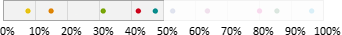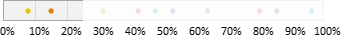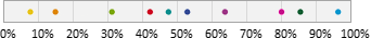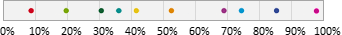 Auswahl-Wahrscheinlichkeit in ProzentGeben Sie einen Prozentwert zwischen 0 und 100% ein. Mit dieser Wahrscheinlichkeit gehört ein Abonnent zur Zielgruppe. Beispielsweise bewirkt ein Wert von 25%, dass ungefähr (siehe Hinweis) ein Viertel aller Abonnenten zur Zielgruppe gehören. Dazu verteilt newsbird alle Abonnenten auf einem Zahlenstrahl zwischen 0 und 100%. Bei 10 "bunten" Abonnenten könnte eine Variante so aussehen: