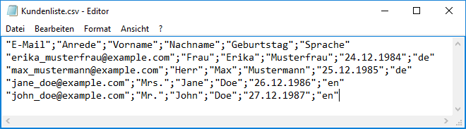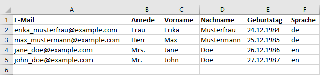 Abonnenten: ImportWahrscheinlich haben Sie bereits eine Liste von Adressen zusammengestellt, die Sie per Newsletter anschreiben möchten. Über das universelle CSV-Dateiformat lassen sich Ihre Adressen aus nahezu jeder Datenbank oder Tabellenkalkulation (z. B. Microsoft Office oder Open Office) exportieren und anschließend in newsbird importieren. Um die Zuordnung der Spalten (z. B. Vorname, Nachname, E-Mail) beim Import zu erleichtern, sollte die erste Zeile Ihrer CSV-Datei aussagekräftige Spaltenüberschriftten enthalten. Ein Beispiel: