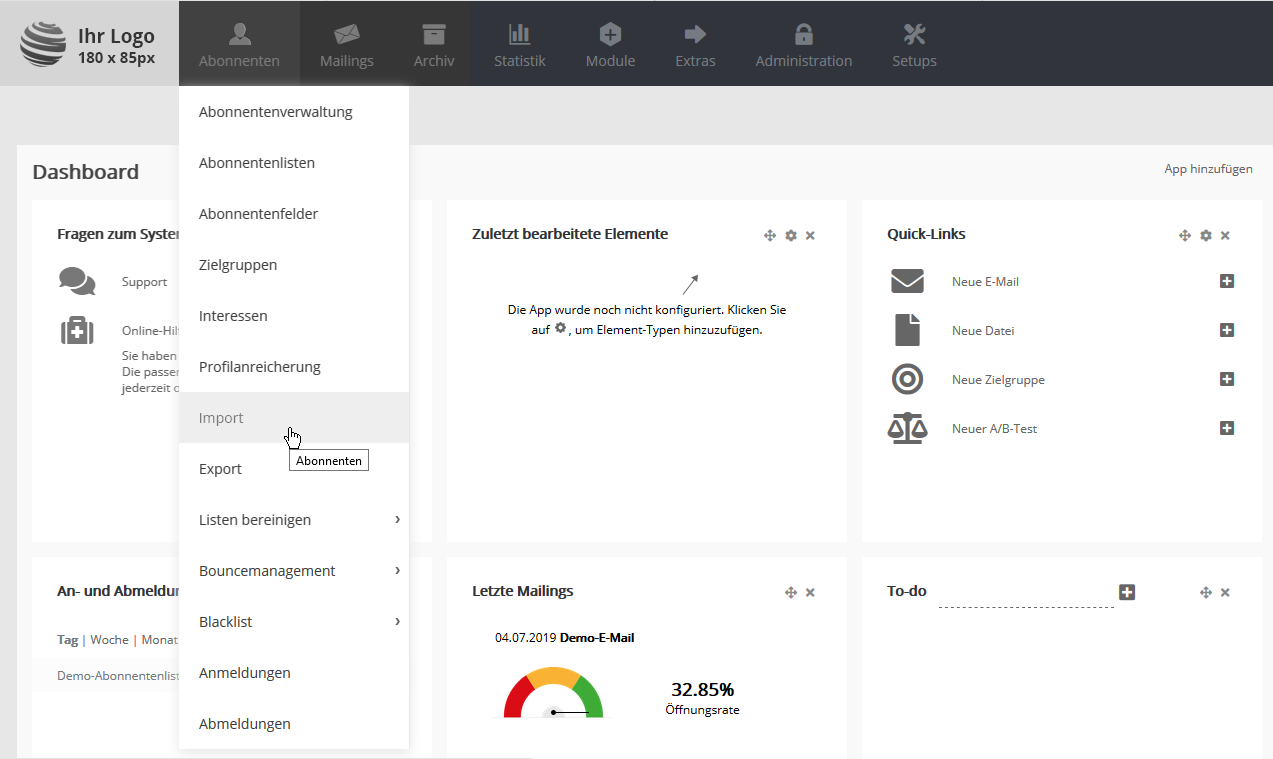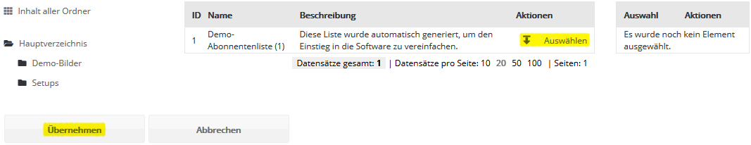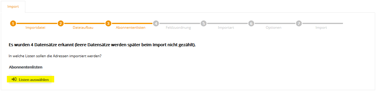 Schritt 3 - AbonnentenlistenWählen Sie nun aus, in welche newsbird Abonnentenliste ihre CSV-Datei importiert werden soll. Falls Sie zuvor keine eigene Abonnentenliste in newsbird angelegt haben (siehe Menü Abonnentenlisten), steht zum schnellen Einstieg die leere Abonnentenliste 'Demo-Liste' bereit. Diese Liste wird in der Regel bei der Einrichtung Ihres newsbird Kontos angelegt und zur Demonstration mit einem Beispiel-Abonnenten befüllt.