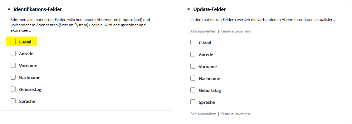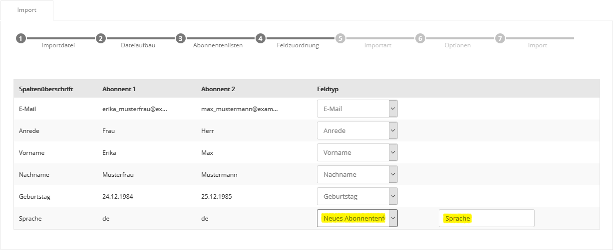 Auch die Auswahl mehrerer Abonnentenlisten ist möglich, falls Sie parallel in mehrere Listen importieren möchten. Klicken Sie nach Auswahl der gewünschten Liste(n) auf 'Übernehmen' und anschließend auf 'Weiter'. Der Name einer Abonnentenliste lässt sich im Menü Abonnentenlisten auch nachträglich jederzeit ändern. Schritt 4 - FeldzuordnungIn Schritt 4 teilen Sie newsbird mit, welche Spalte (z.B. Vorname, Nachname) Ihrer CSV-Datei in welches newsbird Abonnentenfeld importiert werden soll. Zum schnellen Einstieg sind typische Abonnentenfelder wie 'E-Mail', 'Anrede', 'Vorname' und 'Nachname' in newsbird bereits vorhanden.