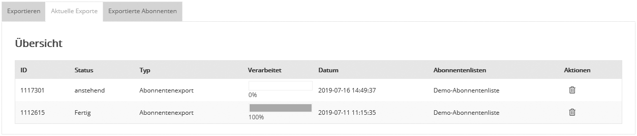 Durch Klick auf die Schaltfläche 'Exportieren' startet newsbird den Export und wechselt zu 'Aktuelle Exporte'. Hier sehen Sie den Fortschritt des aktuellen Exports. Dem Verlaufsbalken sowie dem jeweils angezeigten Status entnehmen Sie, wann der Export erfolgreich abgeschlossen ist. Im Reiter 'Exportierte Abonnenten' finden sie die Export-Datei, die Sie nach einem Klick auf 'Download' auf Ihrem Computer speichern können.