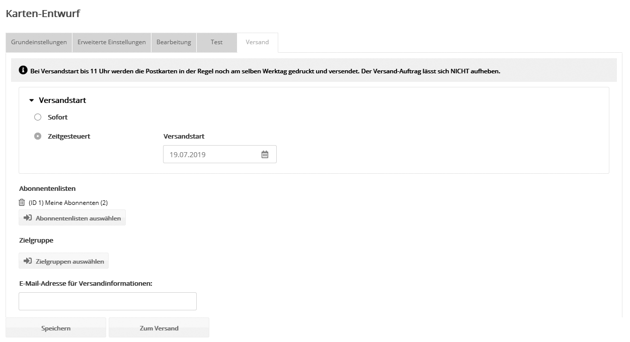 Im Reiter 'Versand' finden Sie die Versandeinstellungen der Postkarte.