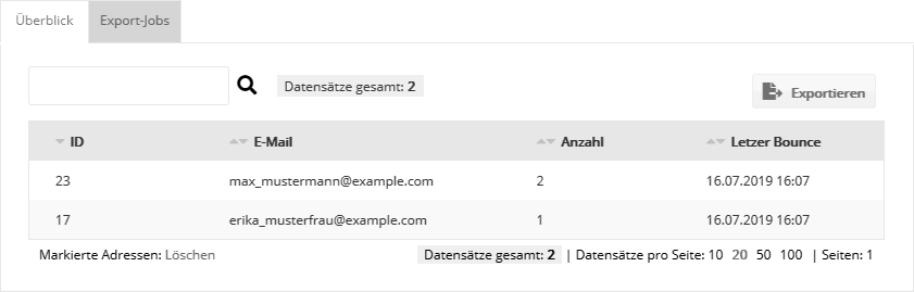 Reiter 'Überblick'Hier werden alle E-Mail-Adressen aufgelistet, deren Versendungen aufgrund von drei aufeinanderfolgenden Hardbounces zurückgehalten werden. Diese Adressen werden auf der newsbird-internen 'Retained List' gesammelt. Verwaltet werden hier ausschließlich die reinen E-Mail-Adressen, unabhängig von den dazugehörenden (eventuell ehemaligen) Abonnenten. Oben rechts können Sie mit Klick auf den 'Exportieren'-Button die zurückgehaltenen E-Mail-Adressen als CSV-Datei exportieren. Die erzeugte CSV-Datei lässt sich anschließend auf dem Reiter 'Export-Jobs' herunterladen.