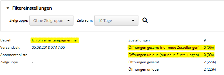 Da das Beispielmailing bereits seit 2018 nicht mehr aktiviert ist, gab es in den letzten 10 Tagen keine neuen Zustellungen. Dennoch gab es in den letzten 10 Tagen noch 2 Öffnungen, quasi "Spät-Zünder", die das Mailing erst Jahre nach der Zustellung geöffnet haben. Ein zugegeben etwas konstruiertes Beispiel, was die Funktion aber hoffentlich verdeutlicht.
