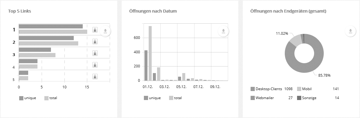 Per Klick auf 'Vollbild' wird die Karte im gesamten Fenster dargestellt. Direkt unter dem Vollbild-Link können Sie per Download-Button die Grafik der Karte in verschiedenen Formaten herunterladen. Hinweis: Obwohl IP-Adressen grundsätzlich nicht an einen bestimmten Ort gebunden sind, lässt sich durch die bekannten IP Adressräume von Internetprovidern, Universitäten und ähnlichen Einrichtungen in vielen Fällen der Standort ermitteln. Da regionale Einwahlknoten häufig einen festen IP-Adresspool besitzen, funktioniert das Verfahren auch bei dynamischer IP-Vergabe. Für die Zuordnung nutzt newsbird eine regelmäßig aktualisierte lokale Kopie einer Geotargeting-Datenbank, die ein externer Dienstleister zur Verfügung stellt. --> Top 5 Links + Öffnungen nach Datum und EndgerätenWie bei jedem anderen Diagramm lassen sich auch hier per Download-Button (rechte obere Ecke) die angezeigten Daten als Grafik- oder Excel-Datei herunterladen. Einzelne Diagramm-Segmente lassen sich ein- oder ausblenden, indem man auf den entsprechenden Punkt in der Legende klickt, z.B. auf 'Desktop-Clients' im Diagramm 'Öffnungen nach Endgeräten'. Damit werden die übrigen Segmente auf 360° gezoomt und deren Prozentzahlen passen sich der neuen Anordnung an. So lässt sich das Verhältnis beliebiger Segmente direkt vergleichen.